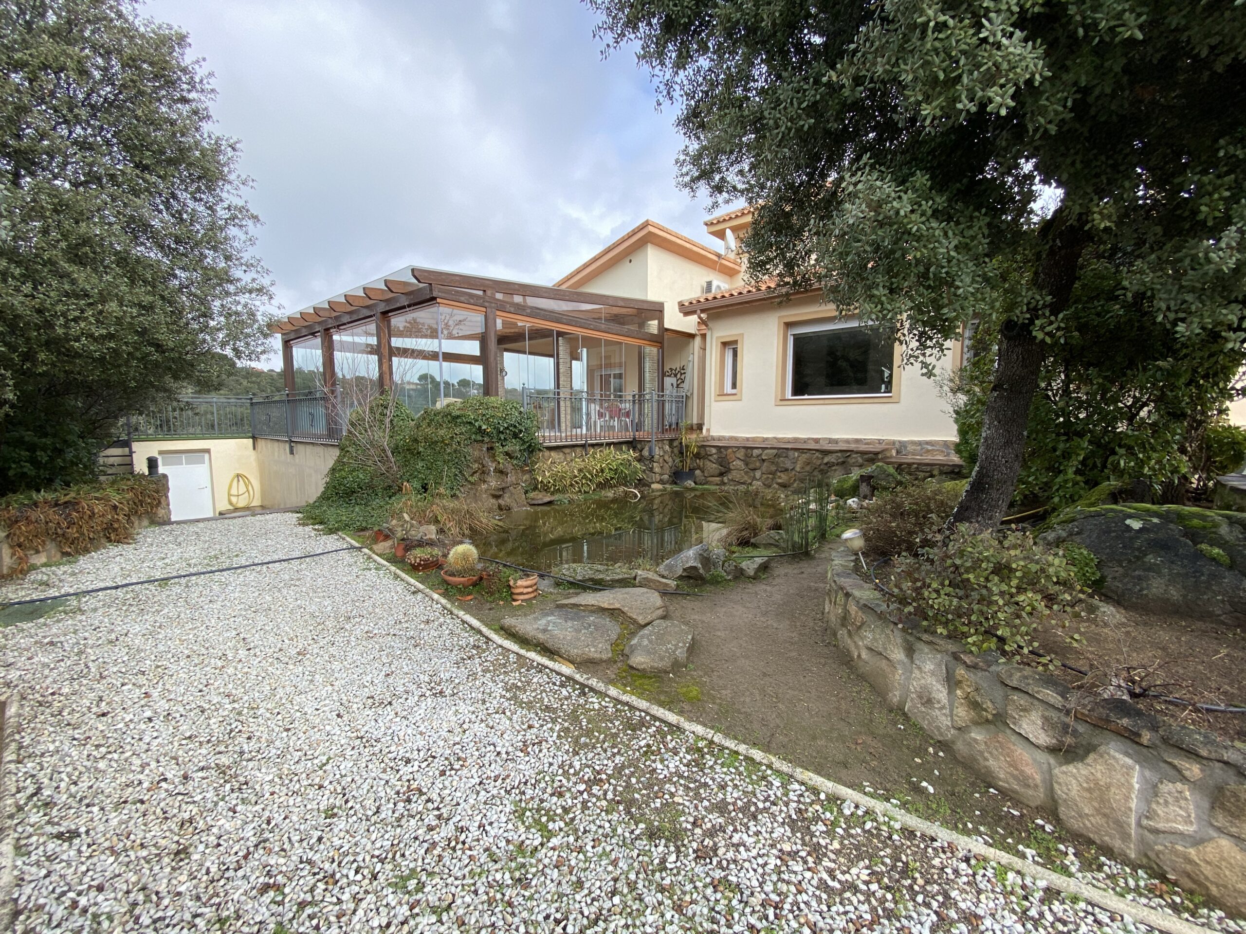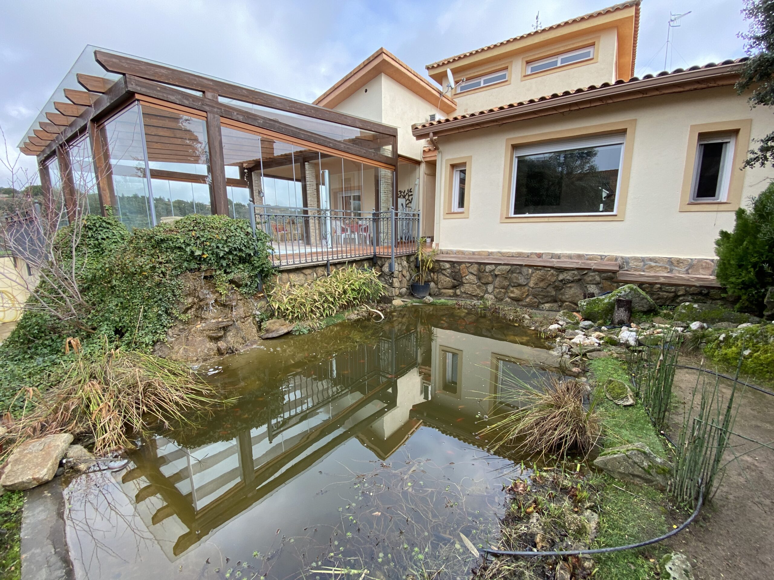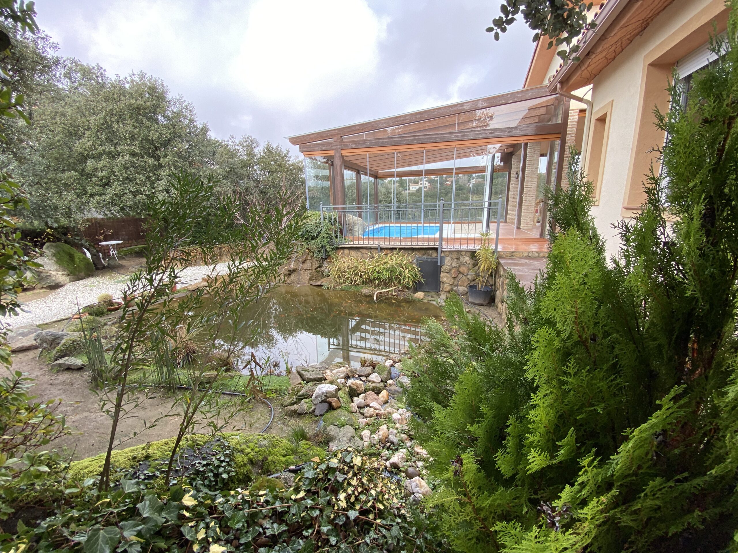 El impresionante jardín dispone de rosaleda con arcos, estanque con cascada y garaje cubierto para dos coches. Pozo de agua no potable ideal para regar las zonas verdes. Aire acondicionado en el salón y estudio.