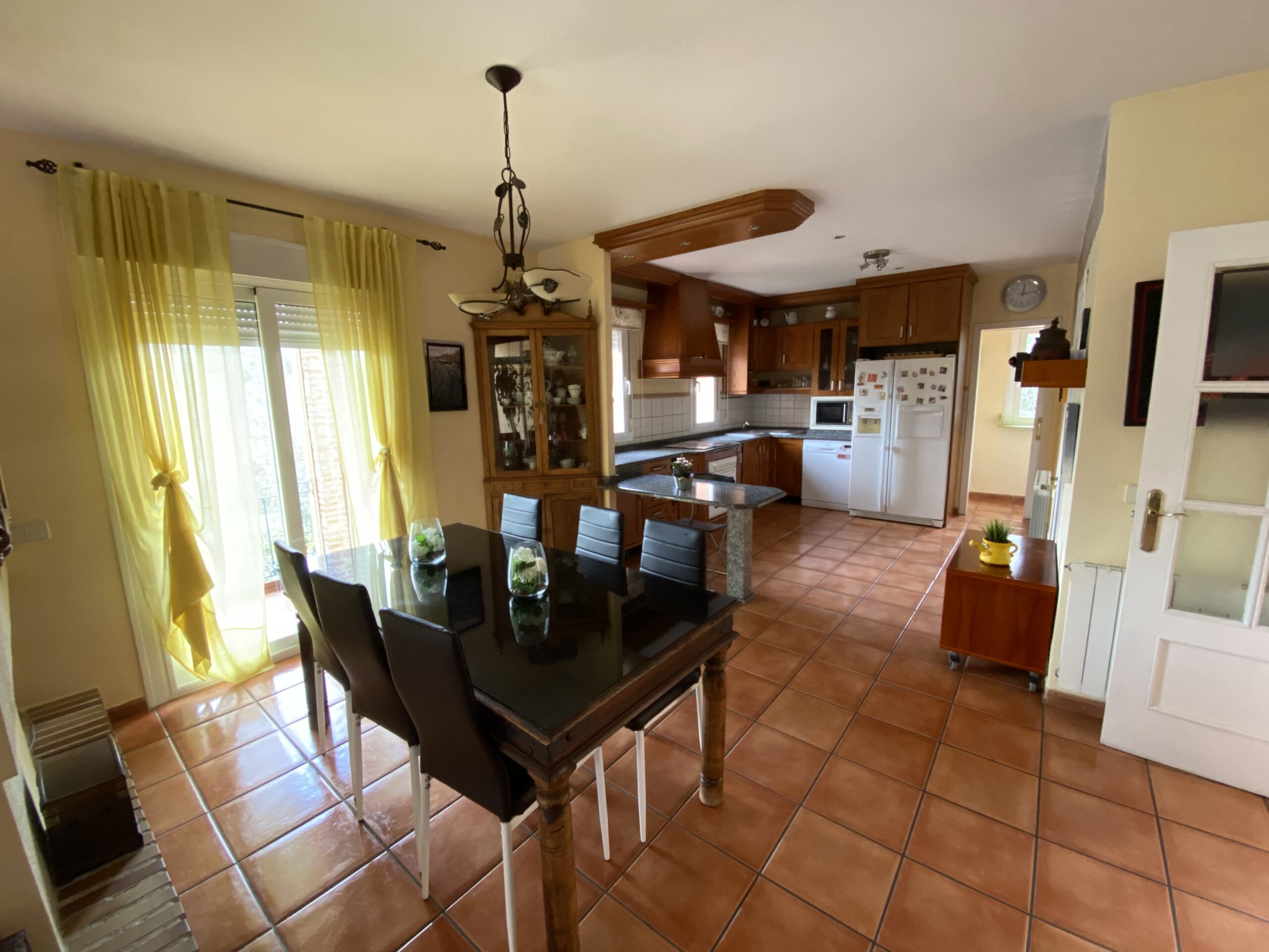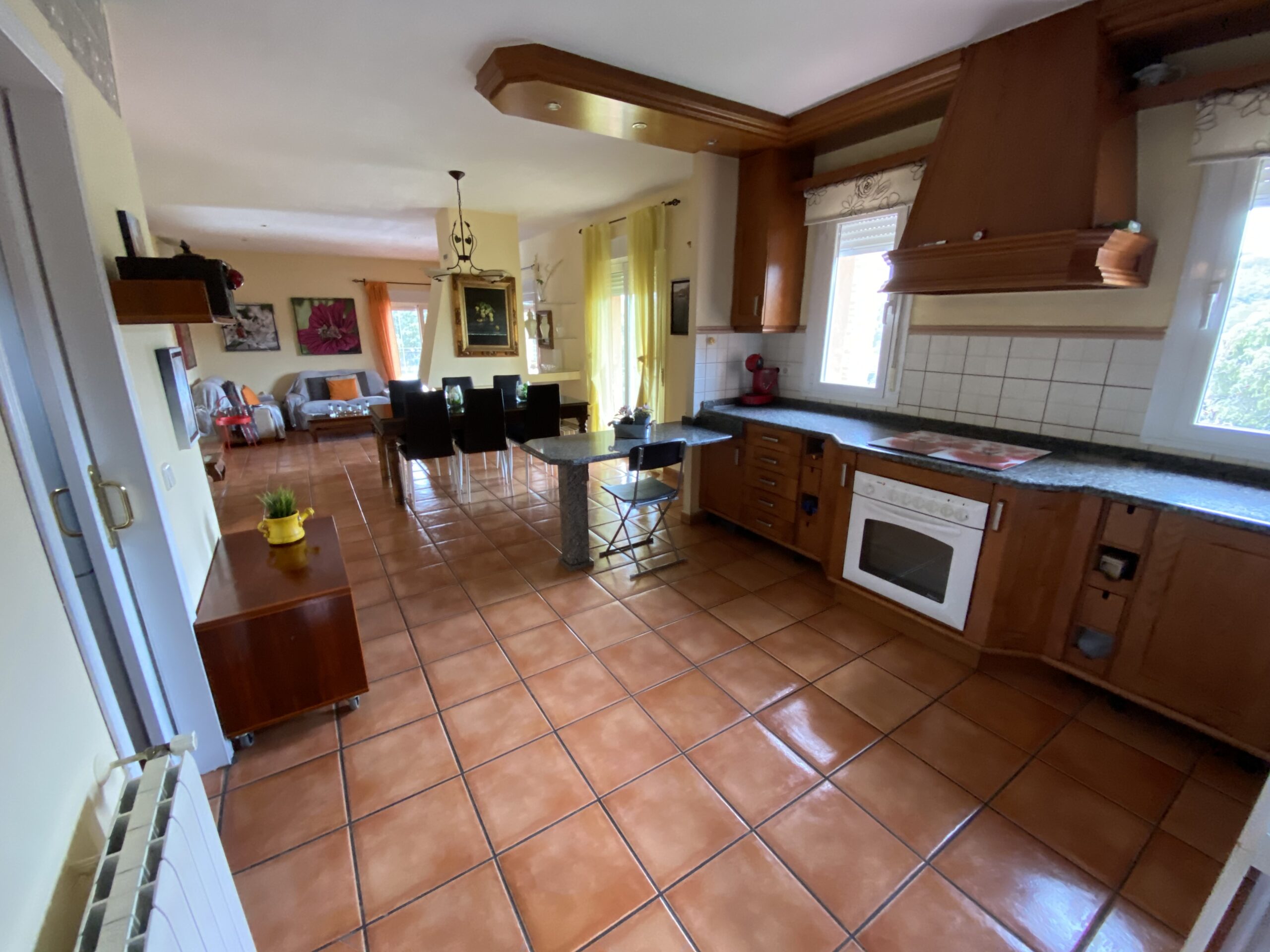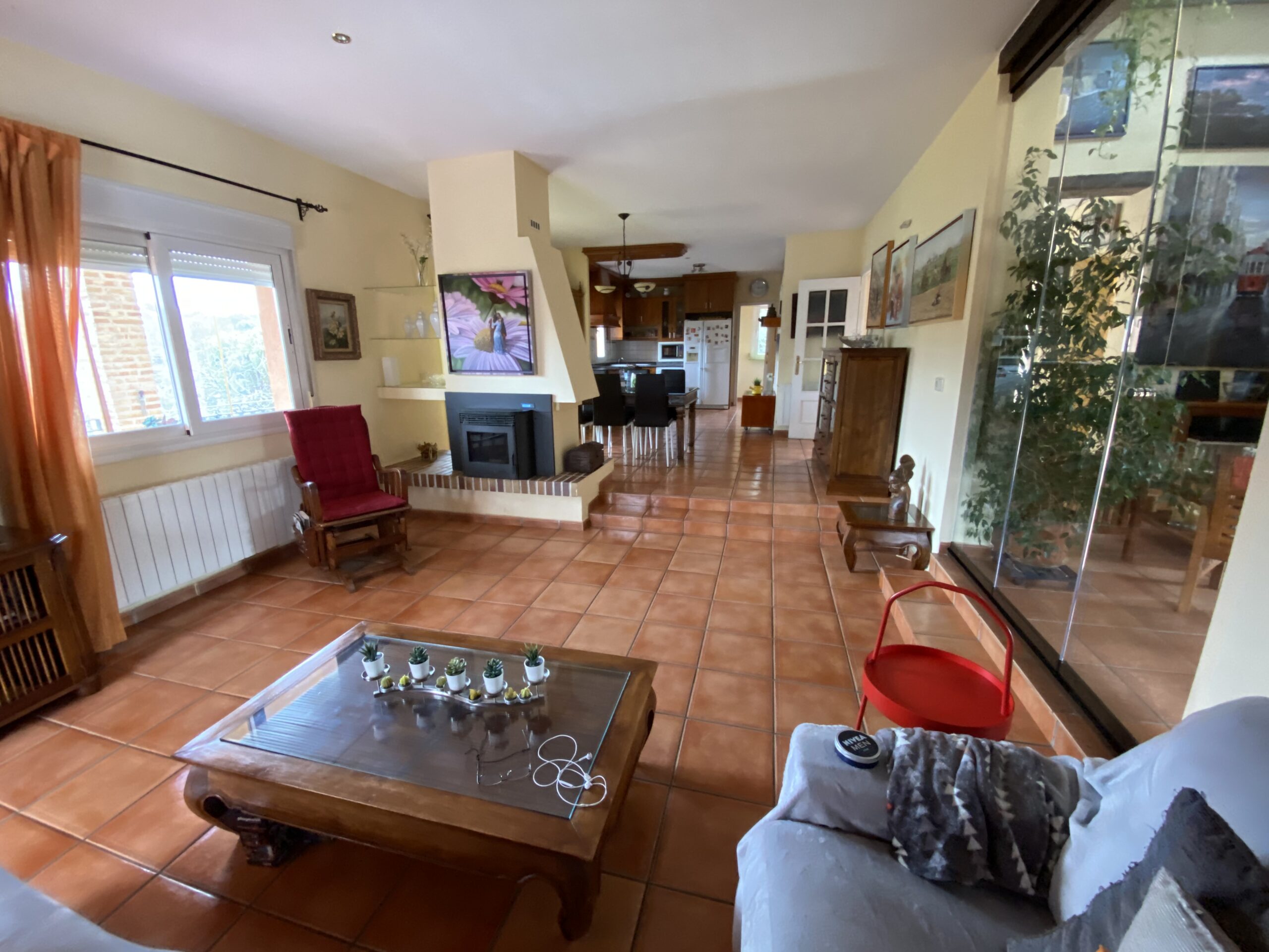 Adjunto al salón dispone de un estudio-despacho de 28 m² con vistas al jardín. El salón-comedor es grande y moderno, en dos alturas, con chimenea de pellets y está directamente comunicado con la cocina abierta en la que hay también cuarto de lavandería, tendedero y despensa. Desde el salón hay salida directa a un porche y piscina, cerrados con cortina de cristal. También hay una despensa, lavadero y tendedero.